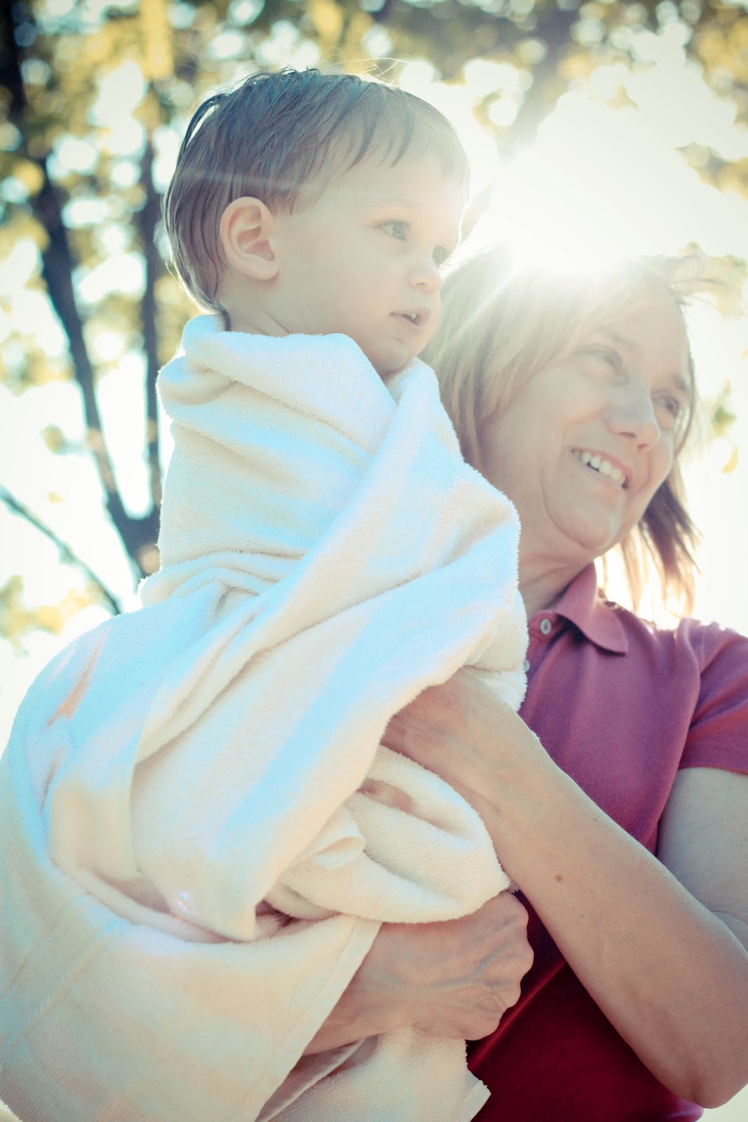 | He dried off about three times before he finally decided to call it quits. Every time Grandma dried him off, he shook off the towel and said "Again?" |